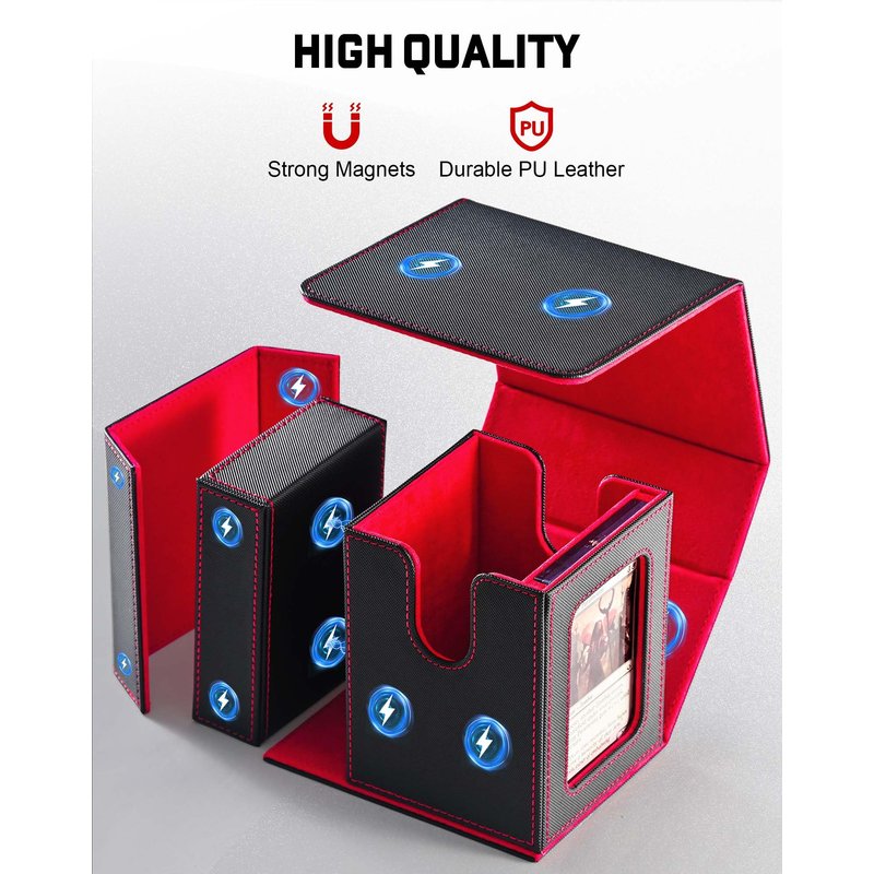 - Innovative Design: Our commander deck box features a convenient U-shaped opening, allowing you to flip the lid and easily view your cards. It can stand upright with the lid flipped open, providing quick access to your cards during gameplay. This box not only enhances your gaming experience but also adds a stylish touch to your tabletop setup