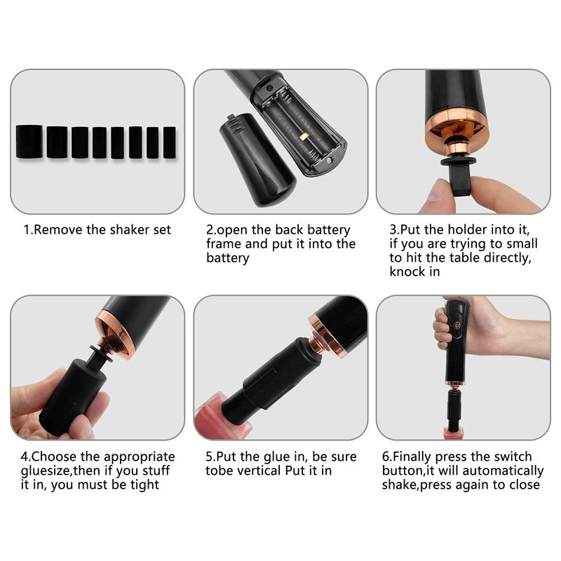 - How to use: Take out the shaker, open the battery box on the back, and insert the battery. Squeeze the holder, if it is too weak, you can directly hit the table and knock in. Choose the proper caliber of the glue, then tuck it in. Put the glue in vertically, finally press the key to shake automatically, press it again to close.