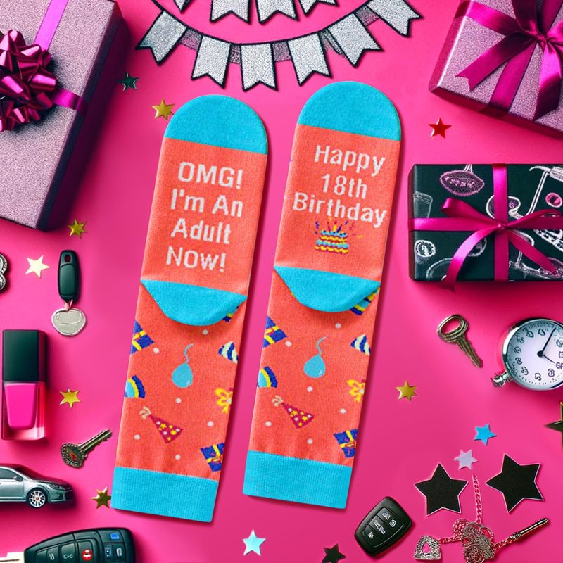 - BIRTHDAY GIFTS: The top of the socks features various birthday gifts, hats, balloons and other elements, while the bottom is sewn with a comical hidden message: "OMG! I'm An Adult Now! Happy 18th Birthday." They're the perfect gift for an 18-year-old girl.