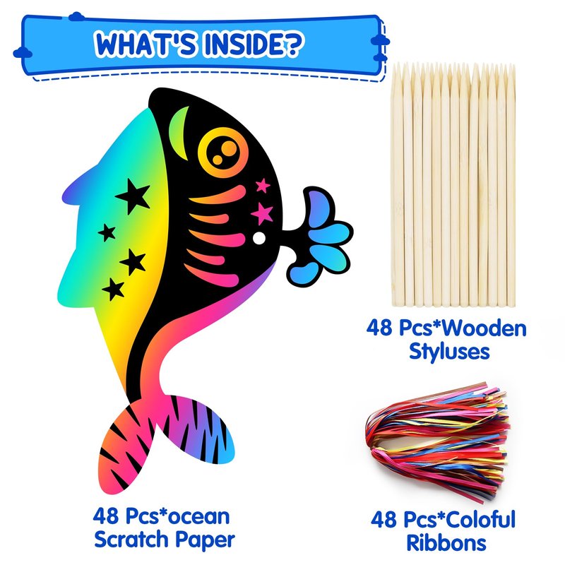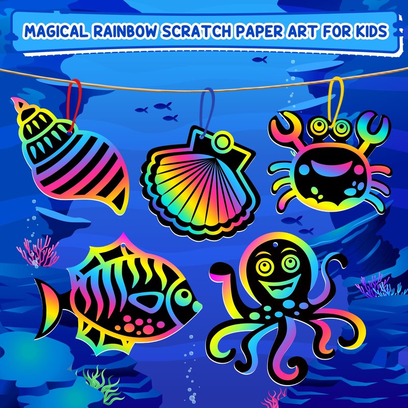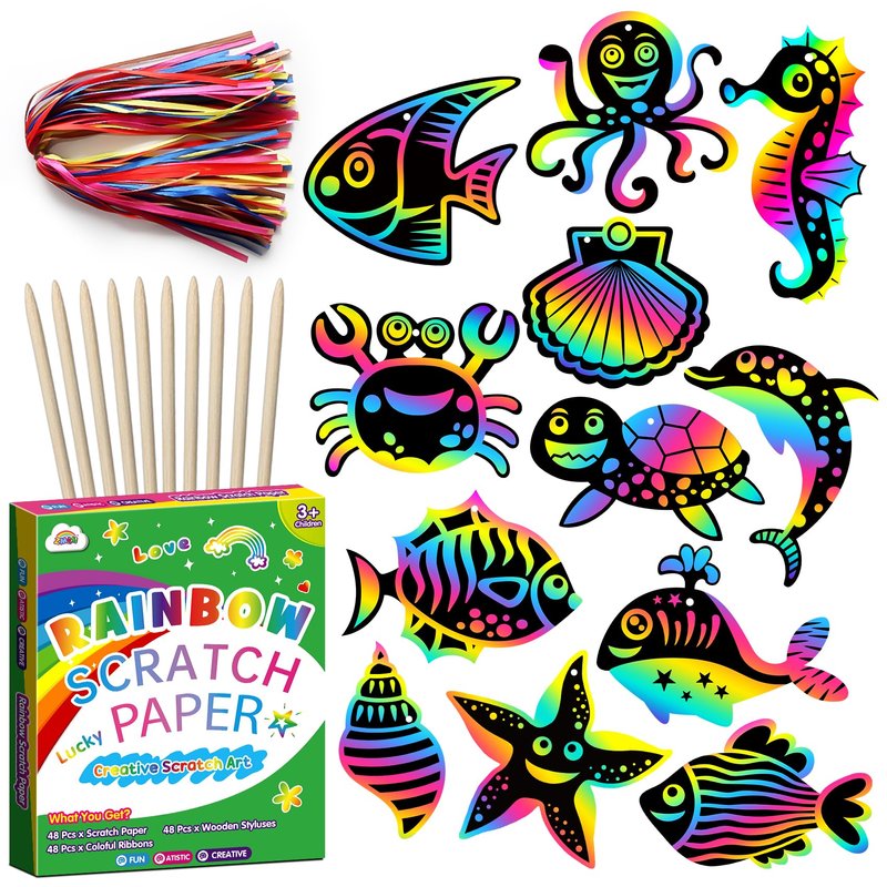 ZMLM Scratch Art Paper Kids - 48 Pcs 12 Style Ocean Animals Rainbow Art Craft Scratch Paper for Party Favor Game Supplies Decoration Halloween Christmas Birthday Gift for Ages 4 5 6 7 8+ Girls Boys