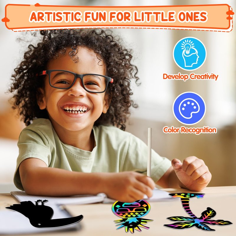 - Unleash Creativity: Our Scratch Art Paper includes 48 scratch papers, 48 colorful ribbons, and 48 scratch pens with 8 different patterns, providing endless hours of creative fun for kids. They can design their own unique dinosaurs scratch paper and make hanging decors with the ribbons