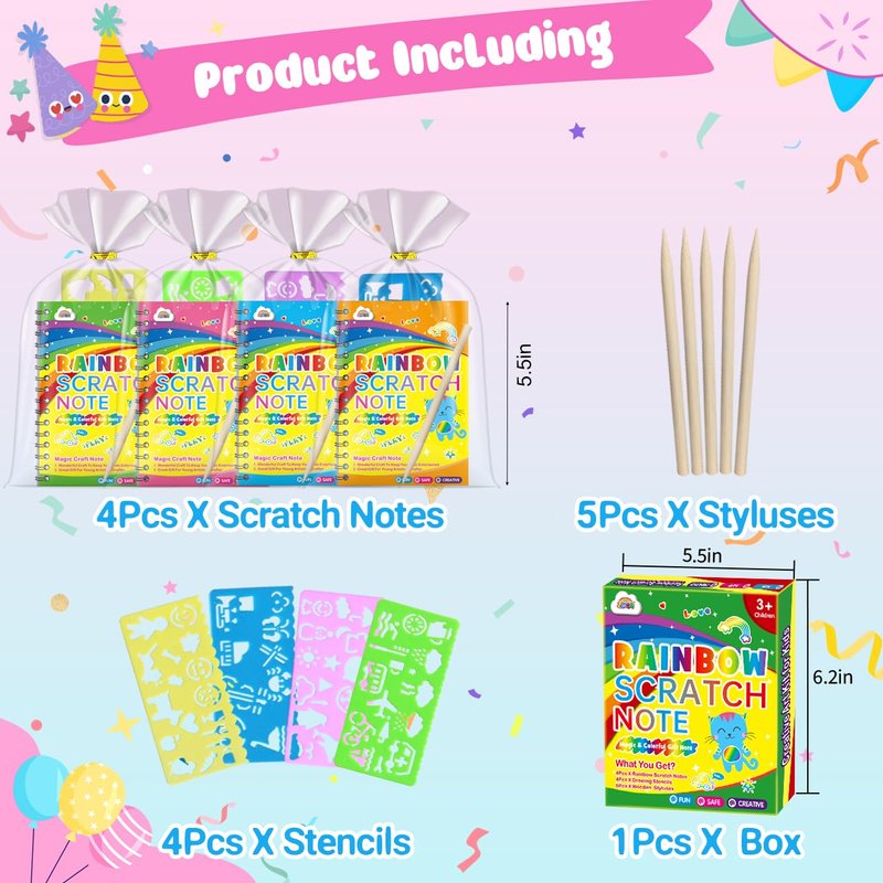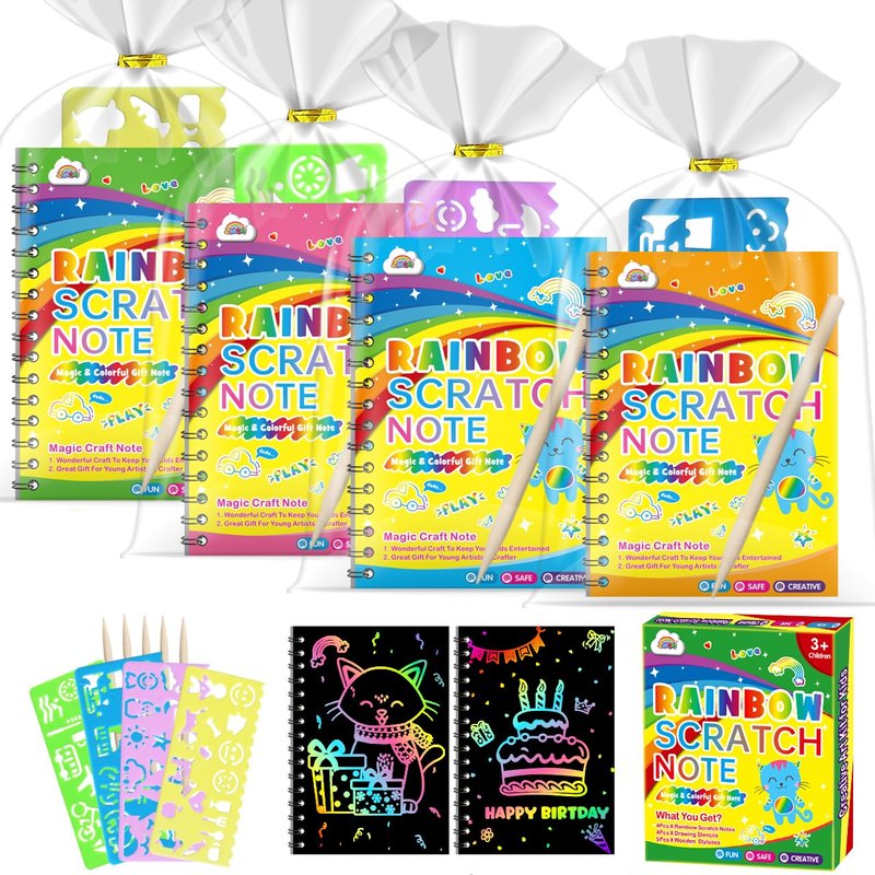 - Arts & Crafts Supplies Packed: Rainbow scratch art notebook Including 4 pack scratch note pads(5.5 x 3.9 inches), 5 wooden styluses and 4 drawing stencils in box. Each rainbow scratch notes have 10 sheets mini scratch paper. Best gifts for girls boys age 3 4 5 6 7 8 9 10 11 12 years old, birthday party favors, classroom prizes for students and birthday goodie bag stuffer.