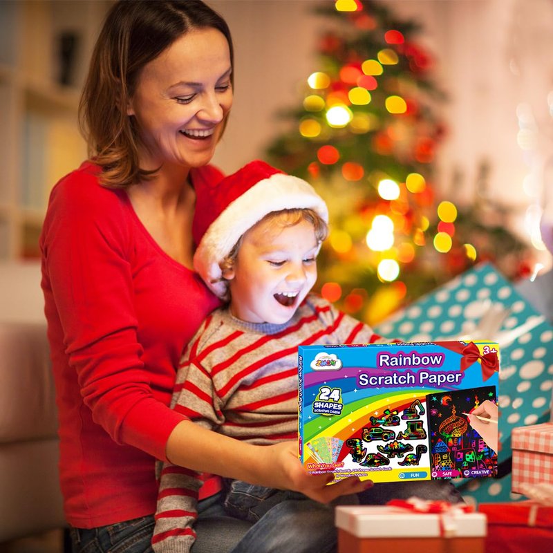 "ZMLM magic scratch paper comes with little wooden ""scratchers "" which like holding a pencil! Scratching off the paper is great for creativity, fine motor skills and hand strengthen. Helps develop skills for handwriting. Plus it's fun and the kiddos get a cute artwork. After you scratch off the black material it's rainbow underneath and you can make any design you want! It's awesome that this is such a big package. There are enough papers and unique shapes for you and your kiddos enjoy a happy timeOur scratch postcard art set comes in a perfect size that allows children to play without any messes in the house or in the classroom. Specifications: Material: paper, wood and ribbon Quantity: 93 pieces Color: Rainbow paper Scratch magic Paper: approx.18.5*12.7 cm / 7.3*5 inch Wood stylus: approx. 14 cm / 5.5 inch in length Ribbon: approx. 40 cm/ 15.75 inch in length Package includes: - 50 x Scratch paper sheets- 20 x Wood Styluses- Various scratch art shapes- Colorful ribbons - 4 x Colorful stencils- 1 x Soft brush Educational Development: It's a funny and innovation crafts for kids, also a very good way to train kids hands-in skills, intelligence development. They will be attracted by the delightful scratch boards and busy with it joy. Kids concentrate attention will be well trained trough finishing the scratch paper art board.Let your imagination be your guide: With 4 set of stencils for your creativity, if your kids you do not how to write the first stroke, don't know how to draw, the 4 scratch stencils will be a guide to draw some simple animals and patterns, and then they could creative their own artworks Good Christmas Festival Decoration with Colorful Ribbons: The girls art and crafts are designed with few Christmas classic elements: tree, socks, star and other cute shapes: elephant,fish, car, gloves and people shape.