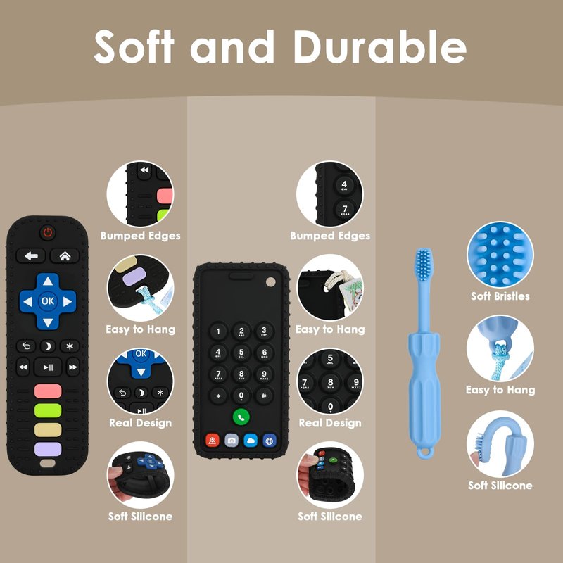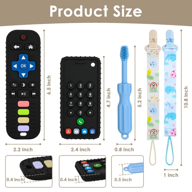 - Satisfied Customer Service: Your baby will get 3pcs teething toy (1 x TV remote control shape / 1 x cell phone shape / 1 x toothbrush shape ) and 2 colors of pacifier clips. If you receive our baby silicone teething toys, whether it is damage product or you are not satisfied with the use of them, please don't hesitate to contact us, we will provide a satisfactory solution for you.