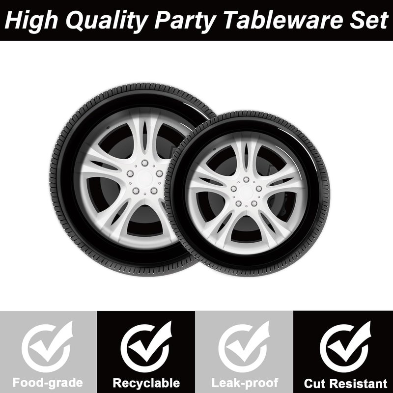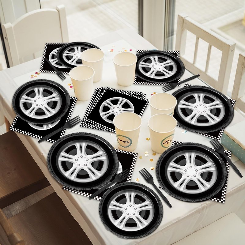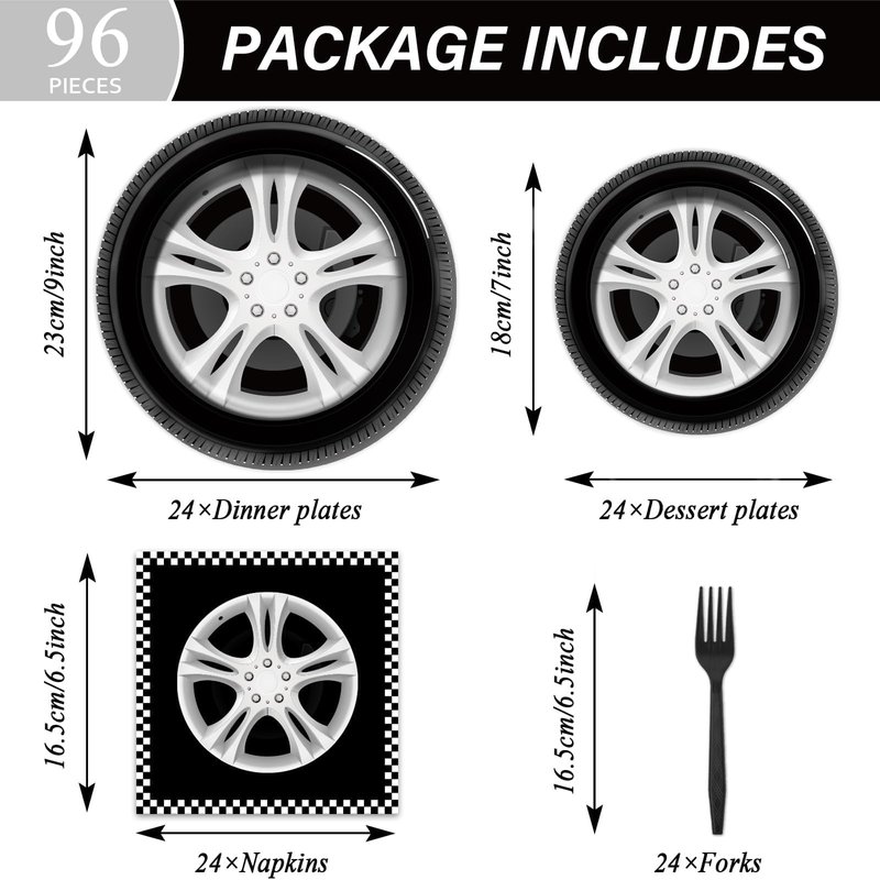 - What's in the package: you'll receive 24 9" race car party plates, 24 7" race car paper plates, 24 6.5" racing car napkin, and 24 plastic black forks, each set serves 24 people guests