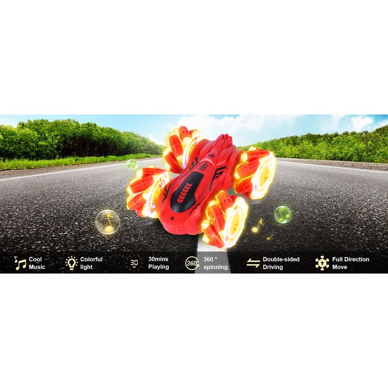 - 【Unique Design&ABS&Structure】Gesture rc stunt car functions:forward/backward,360° extreme spins,right/left turn,One Key Demo,full-directional drifting with colored lights music.With ABS material and strong structure make rc twist car tough.It can drive across various terrains