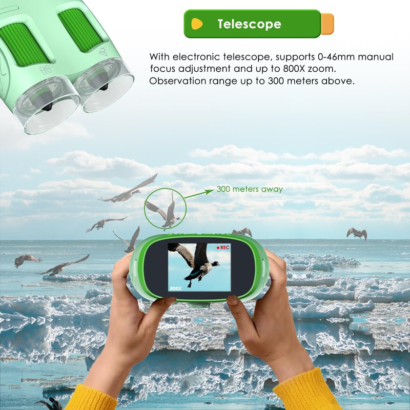 - 【Electronic Telescope Function】 This handheld kids learning assistant with telescope function, also supports 0-46mm manual focus adjustment and up to 800X electronic zoom. The telescopic viewing range up to 300 meters or above. Let the kids experience the excitement of the big and small worlds in one device.