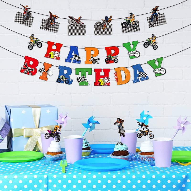 - How to use: the happy birthday banner and mini motocross cupcake toppers are pre-assembled (except for the larger cake topper) that can save your time, and you can decorate your party easily just by yourself, such as cakes, desserts, ice cream, muffins, pastries, appetizers and biscuits, making the food more beautiful and attractive