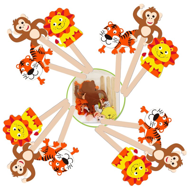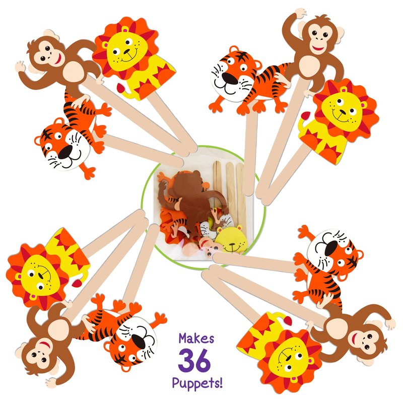 - Includes self-adhesive precut foam pieces and popsicle sticks for creating 12 foam animal stick puppets - Set consists of 4 individual packages each containing 3 assorted style kits - The foam zoo animals range in size approximately 3" - 3.5" each
