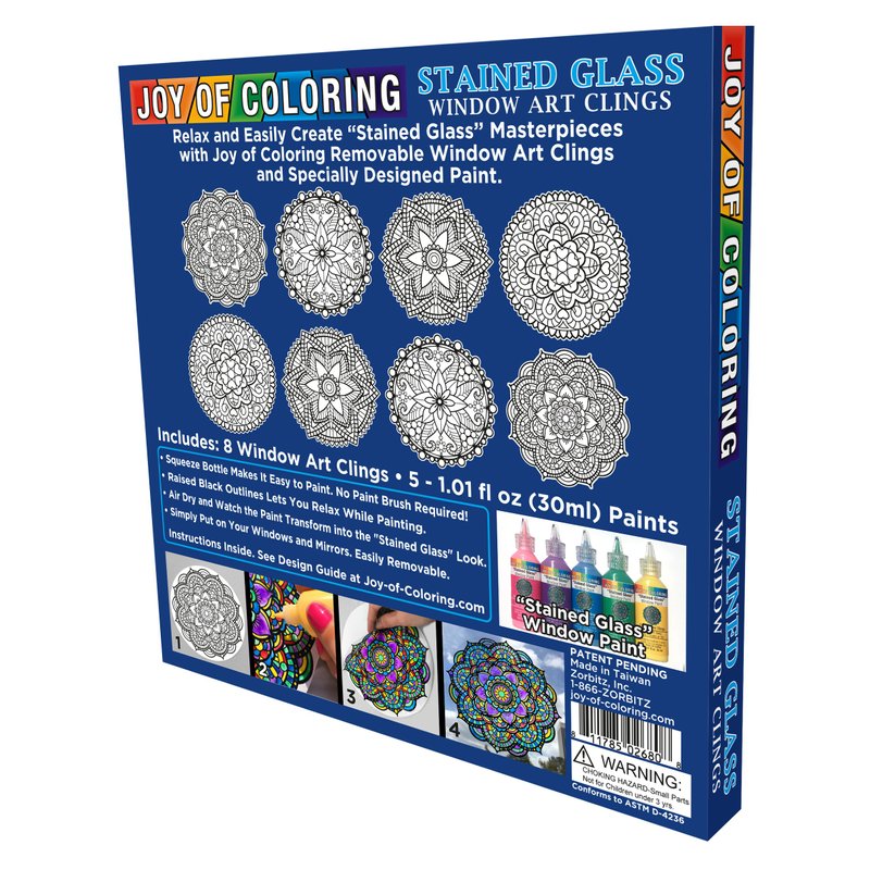 ZORBITZ Joy of Coloring Stained Glass Window Art Clings DIY Kit,8 Clings& 5 Paints,4 Gorgeous,Intricate Mandala Designs,Designed Paint,Removable Clings, Sticks to Any Glass Surface,13 Piece Set,(2680)