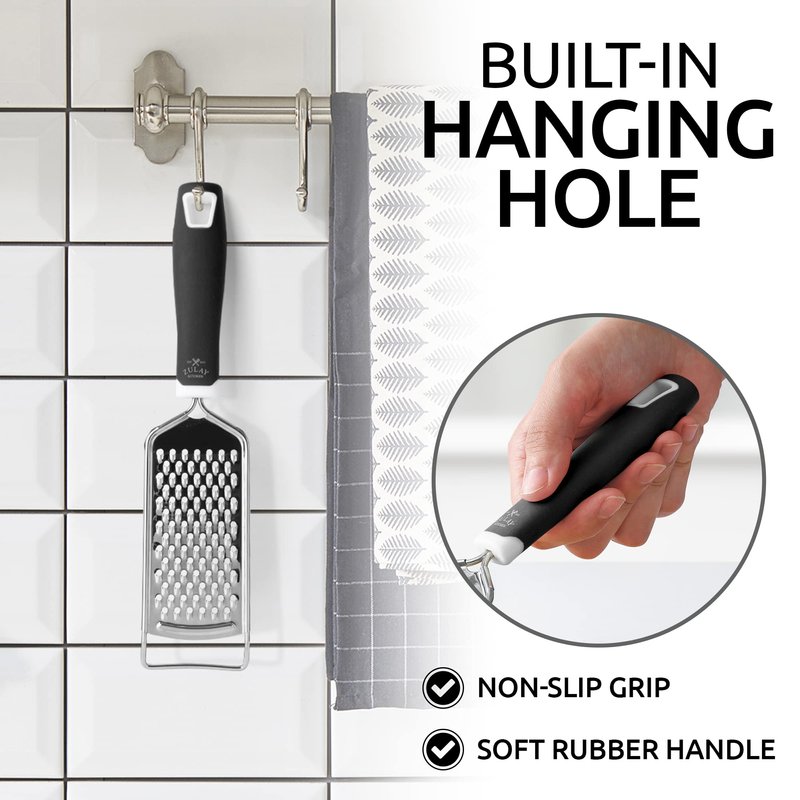 - EASY TO CLEAN & STORE: Unlike a box grater, our flat cheese grater can be easily cleaned in the dishwasher or by running it through water. It comes with a hanging hole for convenient storage.