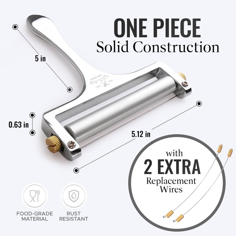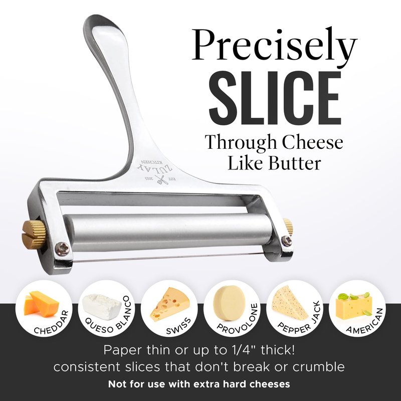 - SLICE CHEESE LIKE A PRO: You no longer need to buy processed cheese slices, as this wire cheese slicer can cut cheese from paper-thin to ¼” thick slices and can also slice up cheese blocks up to 3.5” wide. Manually adjust the thickness of the wire slicer to get cheese just the way you prefer.