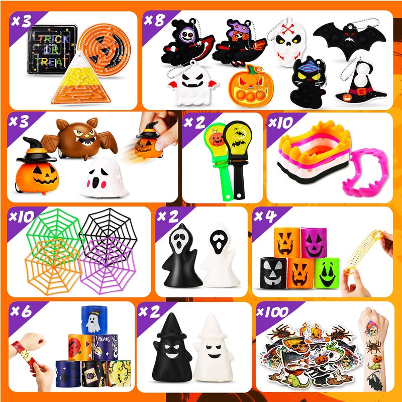 - Special And Memorable Gifts. This Halloween goodie bag fillers contains rich Halloween elements such as bats, demons, spider webs, ghosts, centipedes, scorpions, skulls, and more, perfectly matching the theme of Halloween parties. Halloween fidget toys is perfect for celebrating Halloween and fully experiencing the fun of Halloween. Halloween party favors has a wide variety of styles and various small toys with diverse gameplay, which can greatly stimulate children's fun of playing. Also, Halloween treat or trick gifts is also an excellent choice for trick or treating without giving candy.