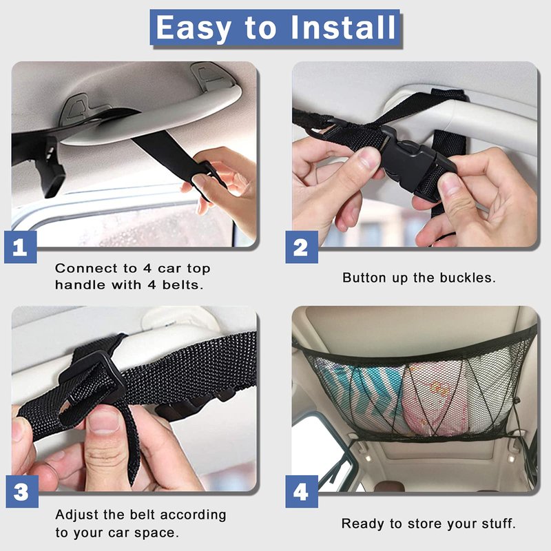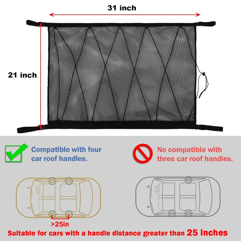 - Compatible with Most Vehicles: The car ceiling cargo net can be installed on the car with four handlebars(such as Jeep, Honda, Toyota 4runner, Ram 1500 dodge, SUV, Van, etc.), but it can't be installed in the car with three handlebars. Please make sure that your car has 4 handlebars before ordering. And suitable for cars with a handle distance greater than 25 inches.
