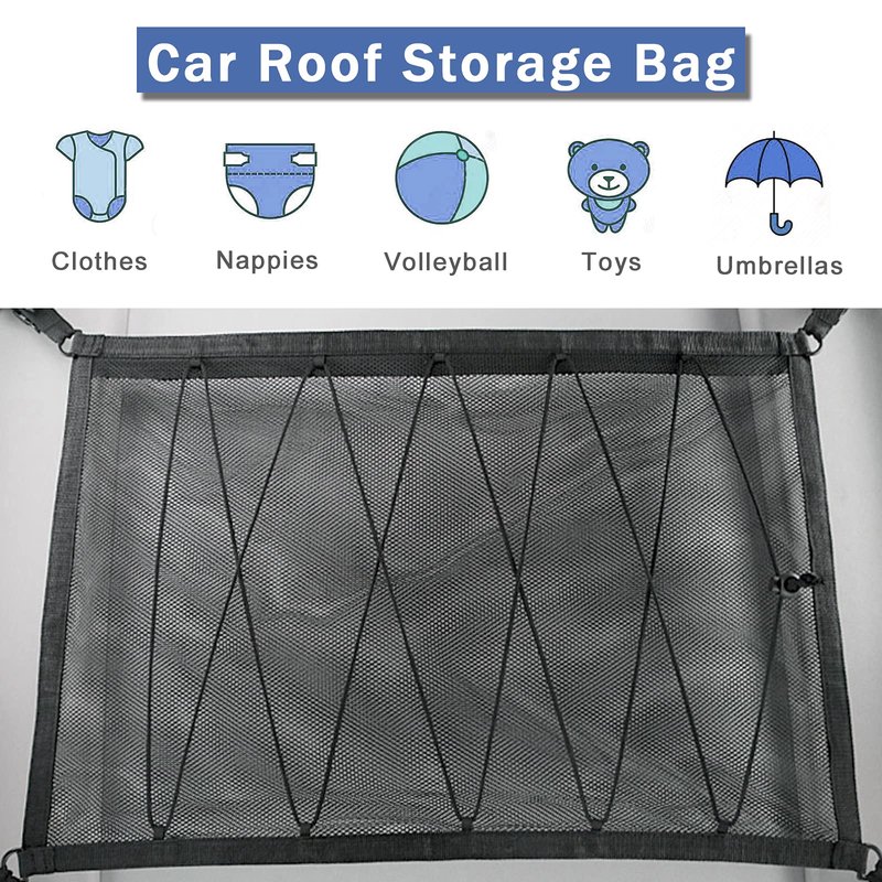 - Space-saving and Large Capacity: the Ceiling cargo net pocket is very helpful for easily accessible extra storage for an extended road trip, it can store pillows, blankets, paper towels, snacks, toys, clothes, rags, towels and other lightweight stuff. Helps you keep your car organized!