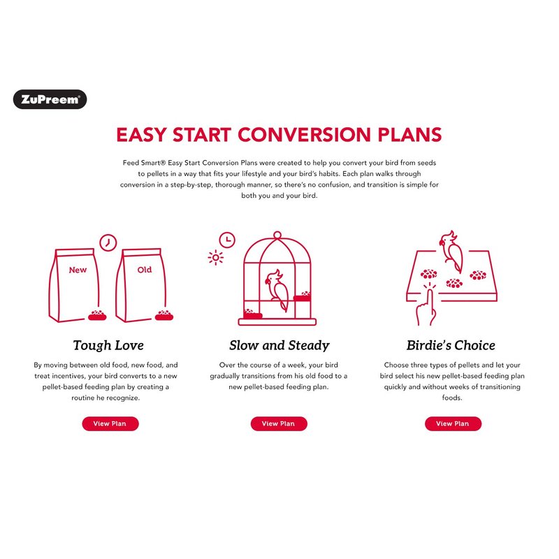 - CONVERT YOUR BIRD TO A HEALTHIER DIET. Converting your bird to a food that includes pellets is worth the effort for his/her health and wellbeing. ZuPreem has been dedicated to producing innovative, high-quality products since 1967.