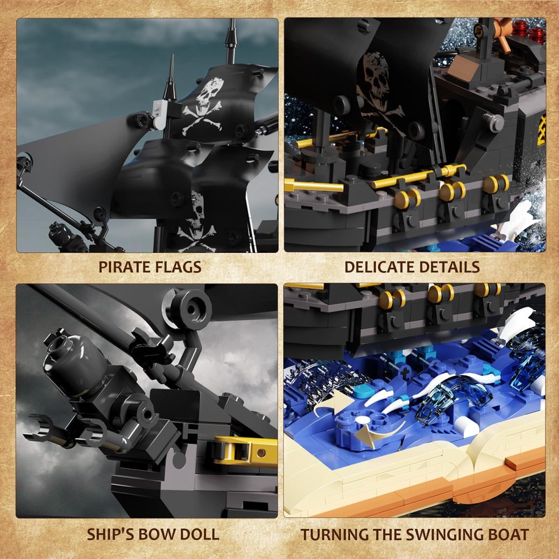 - 【Cool Construction Sets for Kids 】Build a black pearl pirate ship building blocks Kit with sails, masts, steering wheels, lookout towers, pirate flags, barrels,and many realistic details.This pirate ship toy will spark child’s imagination and take them on a mysterious sailing journey. Thrilling sea-faring adventure await!