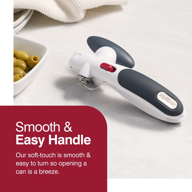 - Smooth Can Opener: The easy turning handle has a soft-touch design that is more comfortable to grip