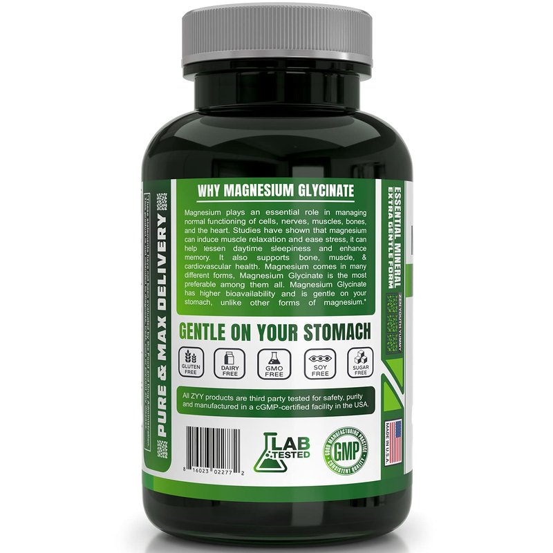 - Maximum Strength Magnesium Glycinate: ZYY Magnesium supplement is designed to promote your overall wellness by delivering the maximum amount of magnesium. 500mg per capsule (180 capsules) 90 days supply. The product is soy-free, gluten-free, dairy-free, sugar-free and Non-GMO.