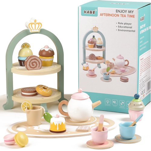 Wooden Tea Party Set for Little Girls Kids with Cupcake Stand & Dessert Food Pretend Play Afterno...